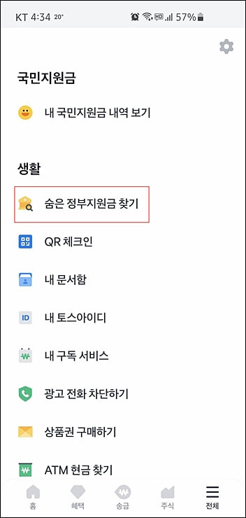 1. 토스 어플로 정부지원금 조회하기!