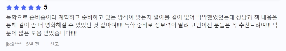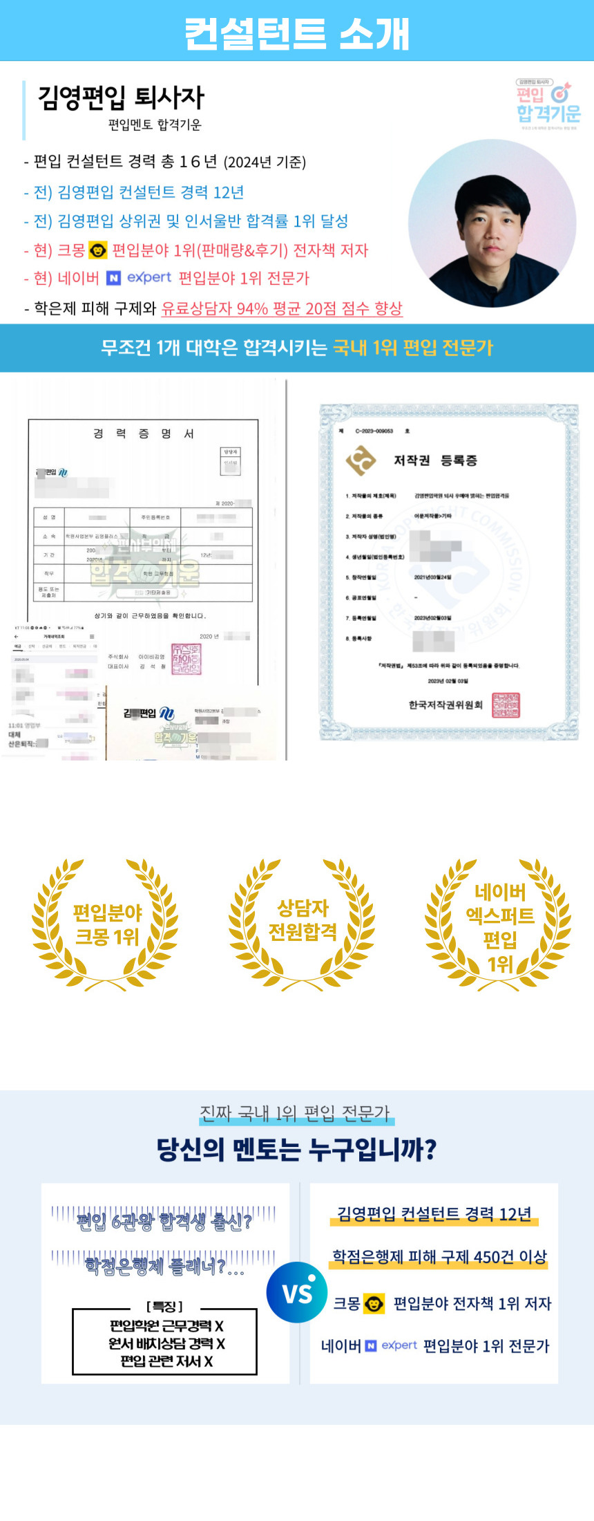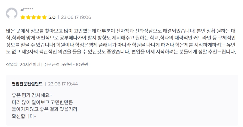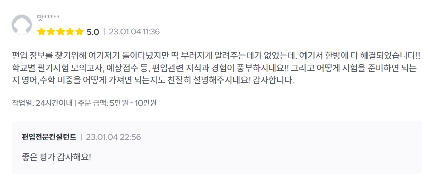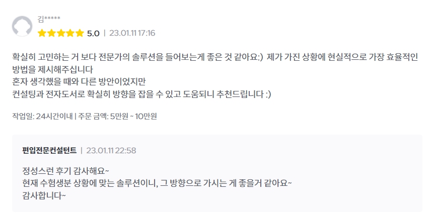 그에 따른 결과로 퇴사 후 최근 3년 간 크몽 편입분야 1위 전자책&상담(판매량,후기), 네이버 엑스퍼트 편입분야 1위 전문가, 유료 상담자 전원합격이라는 성과를 내었구요.