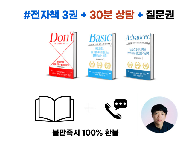 제 상품(전자책&상담)에 대한 자신감이 있기에 불만족시 100% 환불과 간접적으로 많은 분들에게 알리기 위해 무료 상담을 진행하고 있습니다.