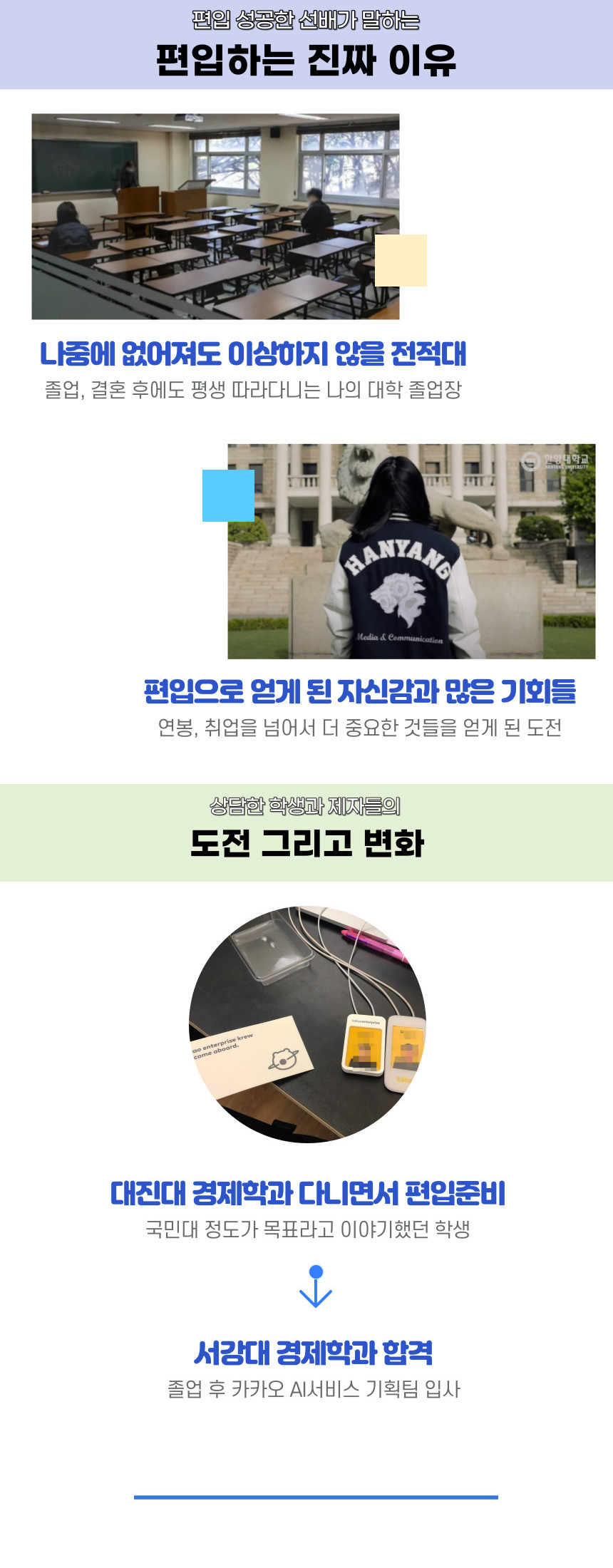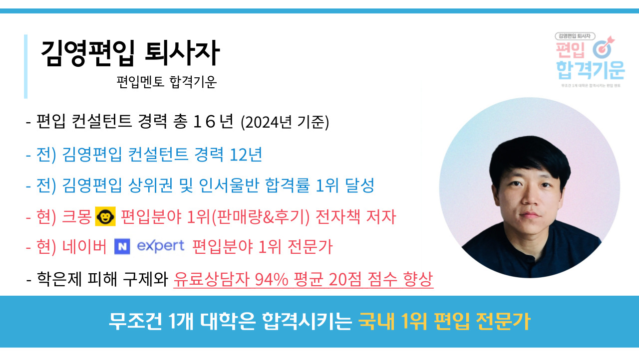 저도 학생 때 편입 4관왕을 했지만 아래 이력 한 줄조차 넣지 않는 이유는 단순히 편입한 이력이 있다고 해서 진짜 편입 전문가가 아니기 때문입니다.